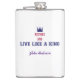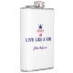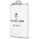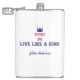The flask itself is fine. It’s a cheap flask, obviously bought in bulk, however am prepared to overlook that. Given that it is a personalized item, I would have liked to have seen gift boxing instead of the generic packaging. Terrible printing, and/or quality. It’s a cheap, tacky vinyl. It is not cut straight and is also applied in a way that it is overhanging the bottom, causing the glue to catch on items and it will eventually roll and tear, damaging the wrap.