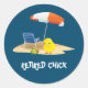 Retired Chick--Beach Scene. Beach umbrella, chair, and tropical drink t-shirt. Popular design.