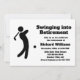 Tee up for an unforgettable celebration! Our modern, minimalistic retirement party invitation features a whimsical twist with the text 'Swinging into Retirement' alongside a graphic of a golf player in full swing. It's the perfect customisable invitation for golf enthusiasts bidding farewell to the office. Personalise the details and let the festivities begin!"