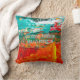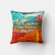 The pillow has an artistic, colourful painted background with vivid colours: orange, red, yellow, teal, along with touches of white.