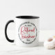 Retired teacher coffee mug with teaching qualities: warm, compassionate, caring, loving, kind, loyal, reliable, fun, dedicated. Handwriting script text based design in black and red. Add your own personalised message or delete extra text field. Makes the perfect retirement gift for your favourite teacher.