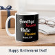 "Goodbye Tension, Hello Pension, Retired Year" Coffee Mug with Retro-Style Colourful Red and Yellow Script Typography. Black and White Modern Design.