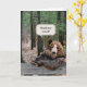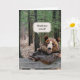 A bear humorously poses with its paws resting on a wooden picnic table in a forest setting for a retirement
