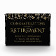 Create a personalised retirement commemorative keepsake award plaque to recognise a retiring employee. Elegant black and gold design with confetti, streamers and lights with the title CONGRATULATIONS ON YOUR RETIREMENT. Personalise with the employee's name, number of years of service and your company, organisation or school name or other custom text. Contact the designer via Zazzle Chat or makeitaboutyoustore@gmail.com if you'd like this design modified or help with another colour scheme, on another product or would like coordinating items.