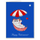 Retirement cat in red and white hammock and star on royal blue blue. Text can be personalised.