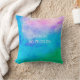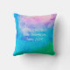 The pillow has an elegant colourful watercolor background with vivid colours: pink, blue, and green, along with touches of white.