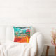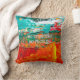 The pillow has an artistic, colourful painted background with vivid colours: orange, red, yellow, teal, along with touches of white.