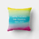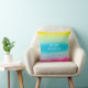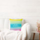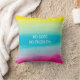 The pillow has an artistic, colourful painted watercolor background with bands of yellow, sky blue, white, and pink.