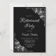 An elegant black and white retirement party invitation featuring ornate lace diagonal corners to frame the white text.