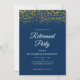 This retirement party invitation features faux gold glitter confetti on dark blue background and is accent with elegant script text.