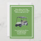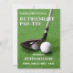 Retirement Party Invitation for Golf Lovers. Gather friends and family to celebrate a special retiree with this Retirement Party Invitation designed with a golf club and golf ball on a green golf turf background. The front side includes the text: Please Join Us For A Retirement Par-Tee, The Name, The Date and Time. The reverse side text includes: The Location Name, Address, and RSVP details, decorated with a white golf cart and green border on a white background. To personalise, simply insert your event details into our easy template replacing the sample text. This Retirement Invitation is available in both print or download.