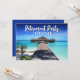 Retirement Party Invitation Tropics Vacation theme card designed with a tropical blue ocean vacation setting. The front text includes: Retirement Party Invitation. The reverse text includes: the Person's Name, Party Date, Time, Location and RSVP Details on a matching blue background. To personalize, simply insert your details into the template, replacing the sample text.