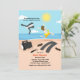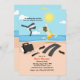 A cute retirement party invitation featuring a man ripping off his working clothes and running in his bathing suit and rubber tube to the beach.