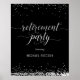 This elegant and festive retirement party value poster features silver (simulated foil) confetti with matching letters that say "Retirement Party" in a beautiful script font. The background colour is black, but can be changed to any colour of your choice. Customise the sign with your own information - an easy and simple way to create personalised decor.