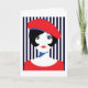 Retro vintage portrait of chic young French woman from the 1960s in a red round neck jumper and beret on dark blue and white vertical stripes background.