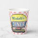 Celebrate your birthday or other occasion with a vintage 1950s sock hop party. These cute paper cups have a retro diner look with a sign graphic and a chequered pink-and-white background. All artwork is original. Easily add your name to the diner sign with the custom template field. These cool paper cups will have you rocking all night fifties-style.