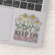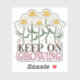 This sticker features a charming retro aesthetic inspired by 1970s groovy art, showcasing whimsical daisies with cheerful smiley faces and organic, flowing stems. The "Keep On Growing" typography uses a bold, wavy serif font in earthy brown and soft pink tones that perfectly complement the vintage-inspired nature theme. It is designed for students, office workers, business owners, plant lovers, and anyone who appreciates a "cottagecore" or "vibe-check" aesthetic. This versatile decal is perfect for personalizing water bottles, laptops, journals, or phone cases, adding a touch of botanical positivity and nostalgic flair to your daily essentials.