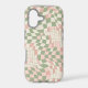 A clean vector style 9:16 aspect ratio pattern file of a retro 1970s groovy wavy chequerboard and distorted grid. The pattern fills the entire canvas with flowing, undulating sage green, blush pink, and cream coloured waves that warp and distort the design. There are no other objects, borders, or frames, just the pure pattern covering the field. Simplified composition, free of complex background details, suitable as a template for phone cases, notebooks, or other print-on-demand products.