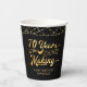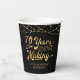 Retro 70th birthday party personalised paper cups featuring the title 70 YEARS IN THE MAKING in a calligraphy script typography which incorporates his or her birth year within the design and your custom text below (the sample shows HAPPY BIRTHDAY NAME) in gold accented with string lights and your choice of background colour (shown in black). ASSISTANCE: For help with design modification or personalisation, transferring the design to another product or if you would like coordinating items, contact the designer BEFORE ORDERING via the Zazzle Chat MESSAGE tab below or email makeitaboutyoustore@gmail.com.