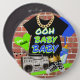 FUN Retro 80's and 90's Hip Hop Urban Vibe! features Black Baby Bodysuit with Fly Gold Chain on a brick patterned background. Green and Blue Graffiti "Ooh Baby Baby" Text with Gold Crown, Baby Bottle, and Boom Box. Blue, Green, Black, and White colours. Retro black and white diamond pattern Customise heart text! ©2021 Miss Sassy Party Pro