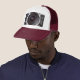 Wear a 'Head Cam' on your head with this hat that features the image of a retro black and chrome single lens reflex (SLR) camera dating from the 70s or 80s. The black and chrome camera has a filigree scroll effect etched on the surrounding chrome body. It's not a real camera; but a digitally printed image on the fabric.