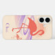 This cool retro personalised phone case features a bold flamingo silhouette with flowing wavy lines and a faded sunburst in soft pastel tones of peach, lavender, and sand.