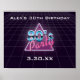 80's Party poster featuring a retro style typography of '80's Party''. Designs include elements of dark purple, blues, and pinks, sci-fi futuristic elements from the 80s, triangle and grid. Customise with event and date.