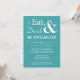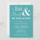 Invite friends and family to help you celebrate your engagement with this funky retro white on aqua turquoise blue Eat, Drink & Be Married! engagement party invitation.