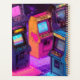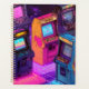 A group of vintage arcade machines stands illuminated by vibrant neon lights. The scene is set against a backdrop of a starry galaxy, creating a nostalgic yet futuristic atmosphere.