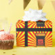Fun, retro style video game design. Design features a pattern of bright yellow and orange-red sunburst pattern squares. Inside the centre of each sunburst is a retro style arcade game console. On the the screen of the arcade game is text in black font that says Happy Birthday. Below, in the black area of the video game cabinet is customisable text in bright yellow font where you can add the birthday boy or girls name for a personalised birthday wrapping paper! Perfect for the gamers or for those having video game or arcade themed birthday party.