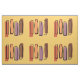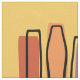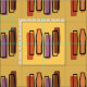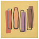 A mid century modern inspired art piece with bold colours of warped pillar-like shapes in orange, red, purple and brown with a yellow background.