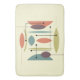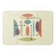 This cool happening mid century modern inspired art has simple shapes with bold 1950s vintage style colours of orange, chartreuse and turquoise, with a light yellow background.