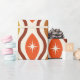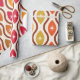 This is elegant mid century modern atomic starbursts pattern placed on colourful ogee ovals between wavy shapes in orange, yellow, red and brown.