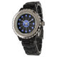 Hip 1950's looking watch face featuring an original digital painting of 12 glossy, plastic looking periwinkle-blue balls attached to 12 silvery rods on a black background. Topped off w/ 2 custom text fields for your initials.
