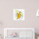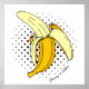 Funky retro popart style print of a yellow peeled banana illustration, over a circle of halftone black dots. Editable text wraps around the bottom corner of the artwork, for you to customise with names or a message