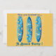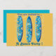 A party invitation for a beach party featuring a retro hip, cool graphic of three blue old school surfboards with a Hawaii vibe in bright and vibrant colours of yellow and blue. The text on this invitation is fully customisable to include your own personal details and background colour is able to be customised.