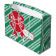 A big red bow decorates this aqua and green striped holiday gift bag. This Christmas gift bag is great for men, women, etc... The design is from original art.