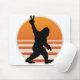 Very cool bigfoot sasquatch yeti cartoon walking and holding up a peace sign, with a retro sunset, aged grungy style design.