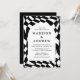 Invite guests to celebrate your special day with stylish Retro Black and White Chequerboard wedding invitations! The invite displays your names and wedding details in black lettering surrounded by a white arch frame. The background features an abstract chequerboard pattern with a black and white colour scheme.