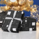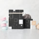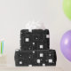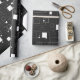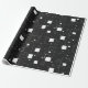This image features a modern, abstract geometric pattern in black and white. It consists of various-sized squares and rectangles arranged randomly across a black background. Some shapes are solid white, while others are outlined, creating a layered effect. Small dots and pixel-like elements are scattered throughout, adding depth and texture. The overall design is minimalistic and conveys a digital or futuristic aesthetic.