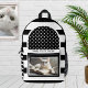 Black and white backpack featuring a retro striped design with polka dots and your custom photo (optional; you can also leave the funny cat reading a book, if you like). Beautiful for school or a book reading club.