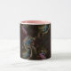 Atomic swirl, 50s space age, mid century modern retro pattern. Black with purple, blue, yellow colour swirls.