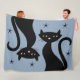 Blanket with black cats with black stars with a "construction boom blue" background reminiscent of the 1950s.