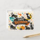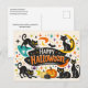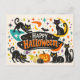 A bold, playful Halloween illustration bursting with mid-century modern charm. Four stylized black cats strike mischievous poses around a dramatic “Happy Halloween” banner, their bright eyes glowing in yellow, orange, and purple. The composition is energized by atomic-age starbursts, crescent moons, dots, and swooping shapes in a lively palette of teal, chartreuse, orange, violet, and black. With its clean style, whimsical motion, and retro-futuristic flair, this design feels fun, festive, and delightfully kitschy.