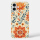 A seamless pattern of oversized retro-inspired flowers in bright orange, deep navy blue, and golden yellow, accented with leafy vines and tiny blossoms on a warm cream backdrop.