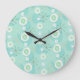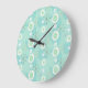 This cute clock is filled with a cool retro pattern in shades of blue, green and orange. The pattern includes star bursts, quarter moon shapes and irregular circles.