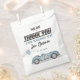 These eye-catching favour bags blend vintage charm with playful whimsy, featuring a beautifully illustrated retro race car in a serene shade of dusty blue.