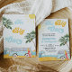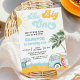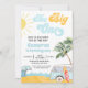 Cute summer surfer themed first birthday invitation for baby boy featuring a van, surfboard, palm trees, wave, sun and retro style text. This the big one first birthday invitation is ideal for a surfer themed first birthday party.