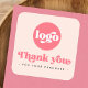 Square business thank you stickers featuring the text "Thank you" in a retro style font and customisable text "for your purchase". Pink (or custom colour) text on a light blush pink background. Upload your logo. You can change colours, move and resize elements with the design tool.