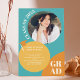 Circle up and celebrate! Our modern elegant boho invitations are the perfect way to announce your graduation in style Featuring a bold font with editable retro teal blue, mustard ans terracotta and circle shapes, add 5 of your favourite photos. invite your guest to your open house and announce your graduation in style.